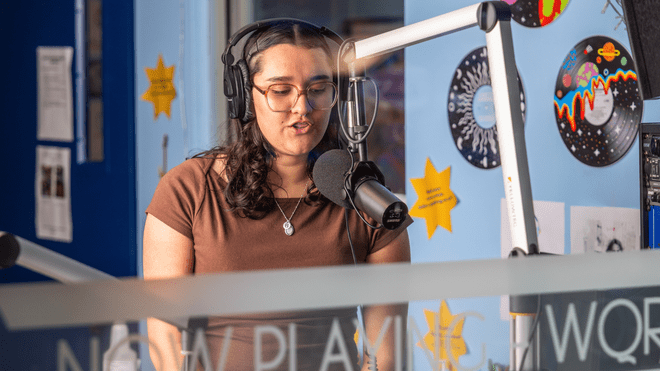 Diaz plays a central role in leading RWU’s student-run radio station, helping coordinate programming, oversee meetings, and support a growing community of student broadcasters. Beyond WQRI, Diaz is also active across campus as a student admissions ambassador in the Office of Admissions, attends meetings with HALSA (Hispanic and Latinx Student Association), and serves as an Orientation Advisor each summer – returning this year for her second season welcoming new students to campus.