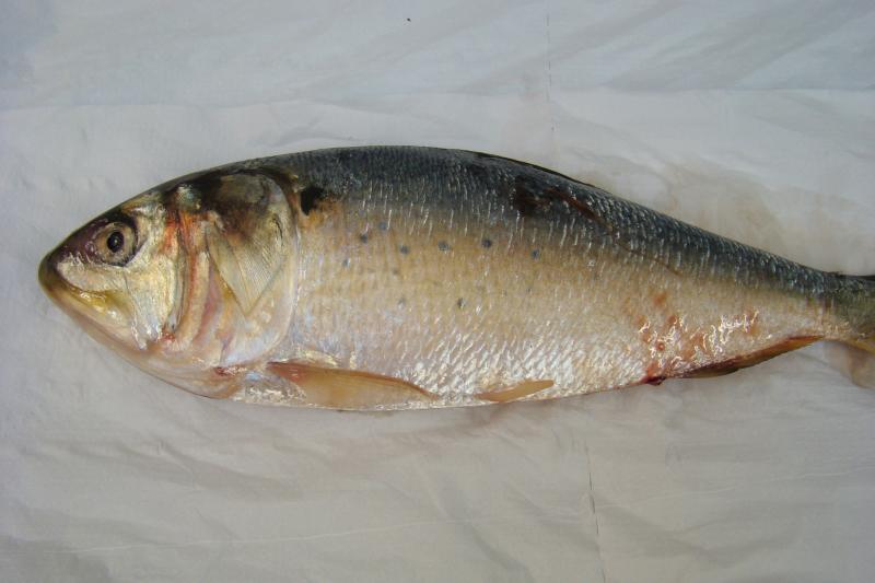 Picture 1: Menhaden with anchor worms far view. Piture 2: Close up anchor worms hooked onto a Menhaden
