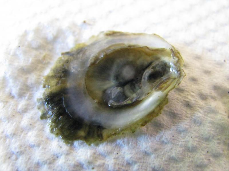 Diagnosis: Deeply cupped left valve, retracted mantle 1, and brown inner shell deposits (conchiolin).2