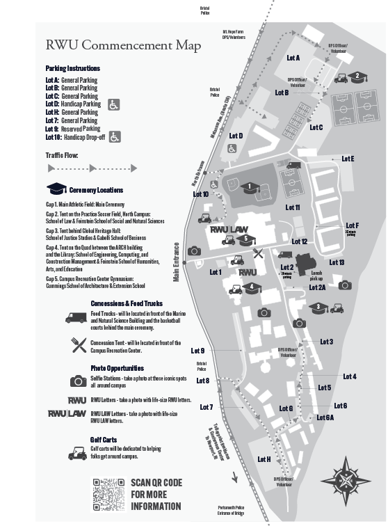 Please plan to arrive early. Graduates living on campus must park in the parking garage only. Guests and graduates arriving from off campus must enter through the North Campus Access road and will be directed by Public Safety to appropriate parking lots. If you are entering campus via Metacom Ave you will be directed to park at Mt. Hope Farm. Public Safety will be present to direct guests to the appropriate lot.