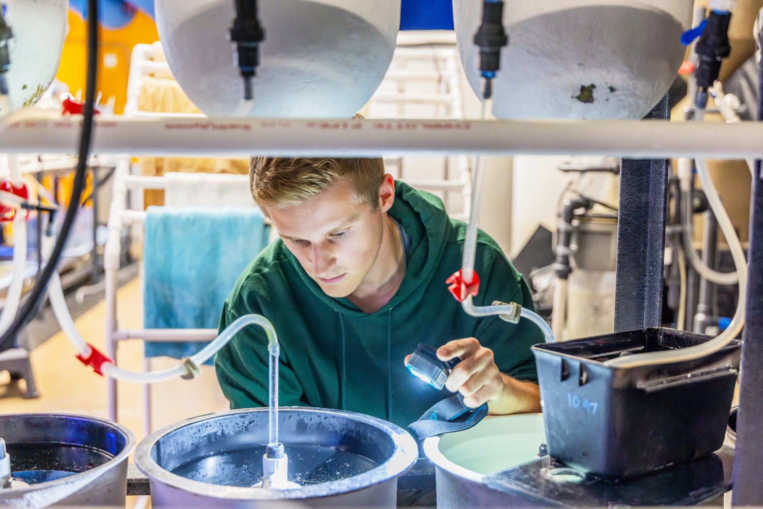 Raising sea robins from eggs to juveniles was a pivotal part of the research responsibilities for Sears, now a senior Marine Biology major with minors in Aquaculture & Aquarium Science and Mathematics from Bedford, N.H. For weeks, he managed the fish husbandry process, ensuring that the sea robins had the optimal environment to develop. He meticulously maintained tanks, monitored water salinity, and prepared live food, even counting the microscopic copepods (also raised in the Wet Lab) to ensure proper feeding levels.