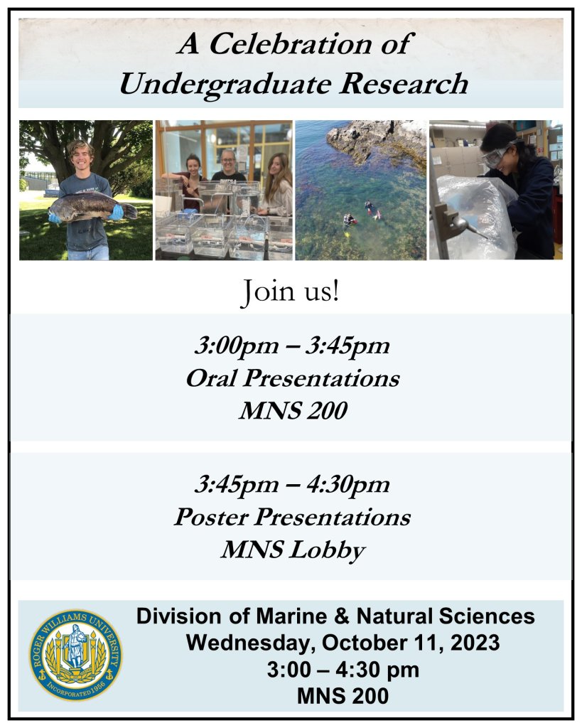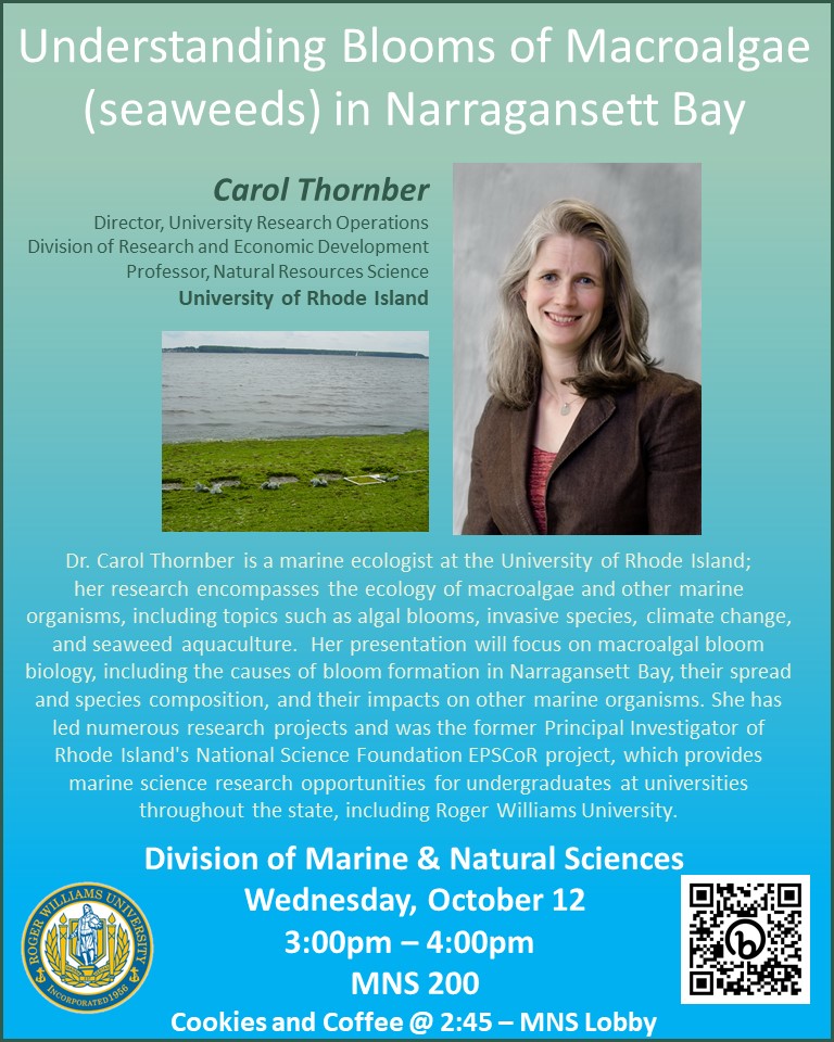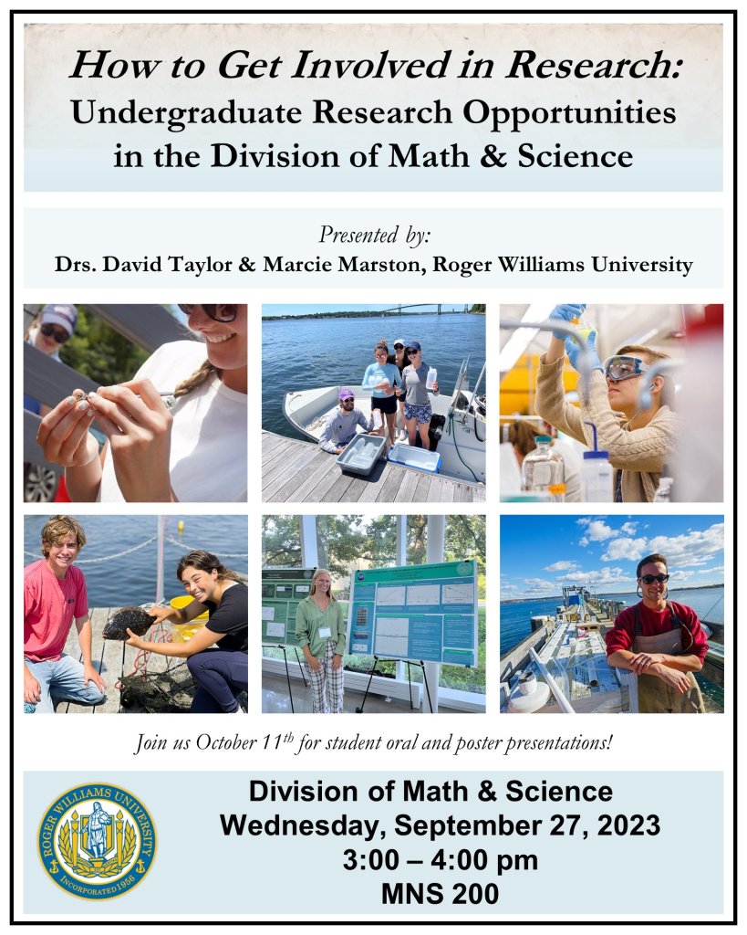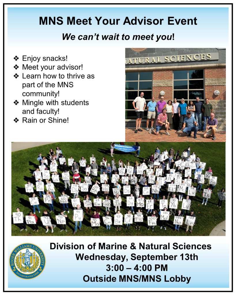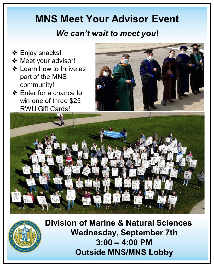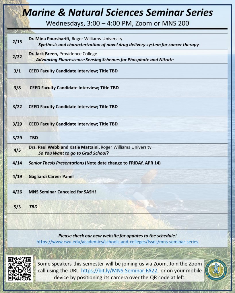 The weekly Roger Williams University Marine and Natural Science Seminar is held every Fall and Spring semester through the division of Marine and Natural Sciences in MNS 200 and/or on Zoom. We invite speakers from within and outside the RWU community to speak on scientific topics including biology, chemistry, physics, math, public health, industry, and science communication & policy. This seminar series also holds events like Meet your Advisor in the Fall and Applying to Graduate School FAQ in the Spring.
