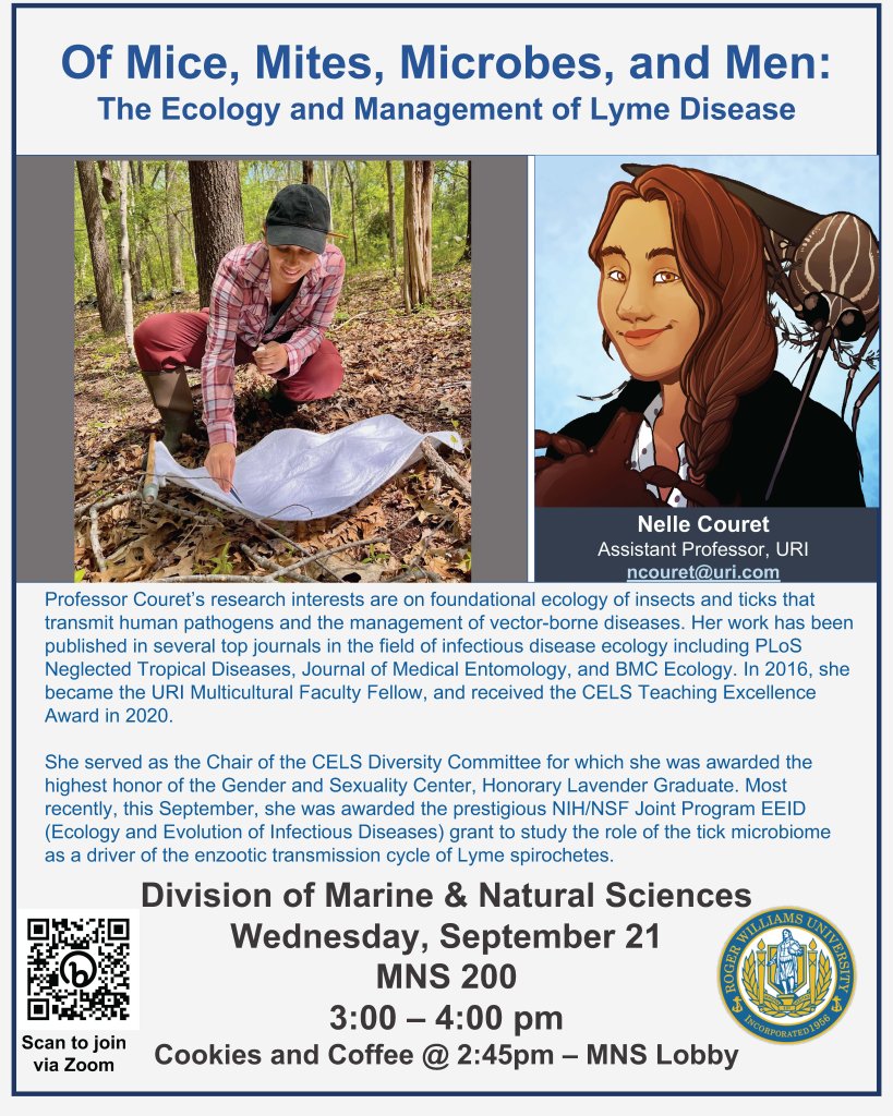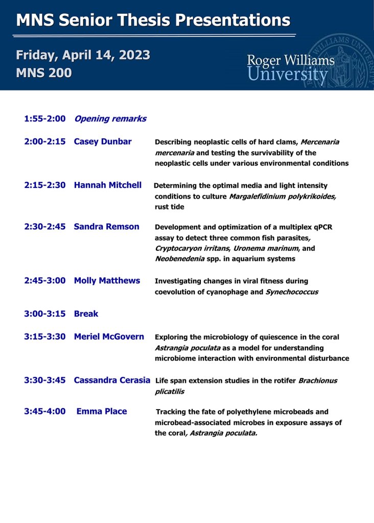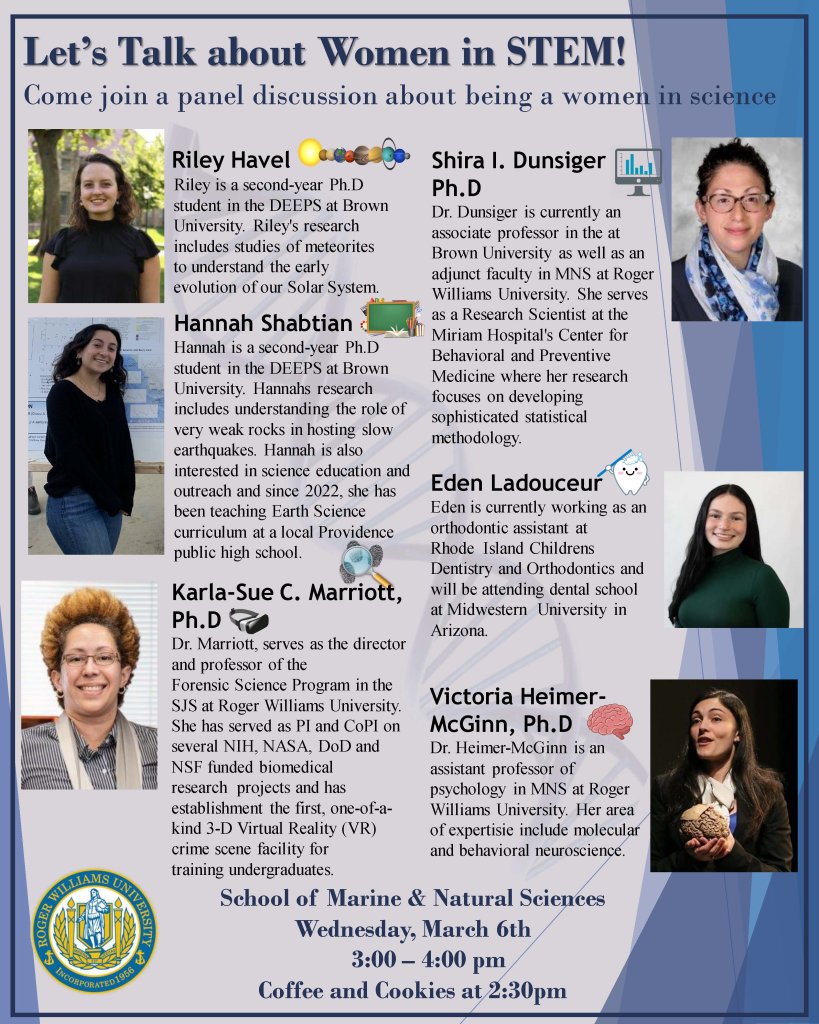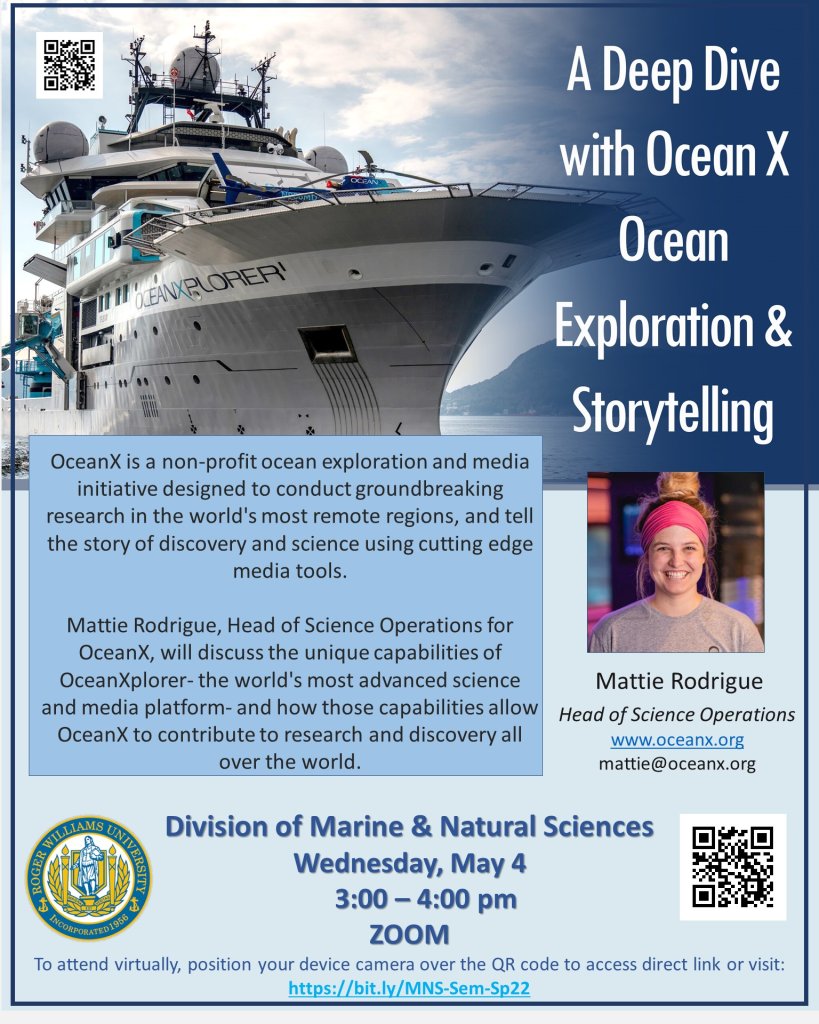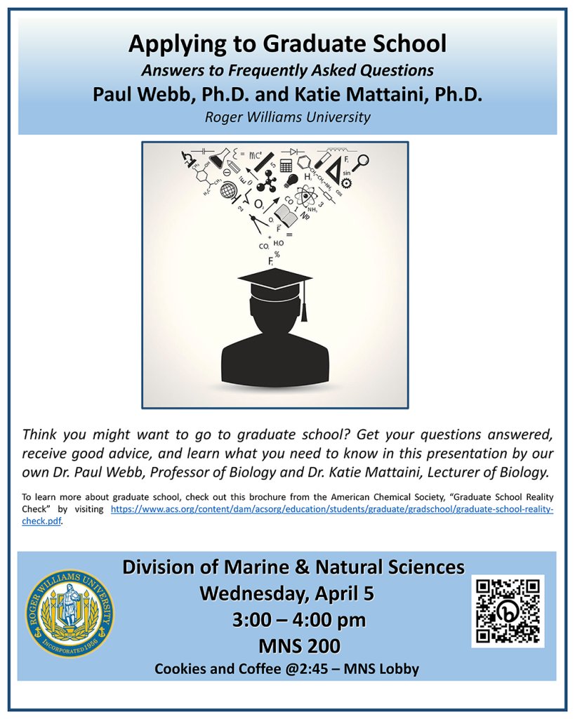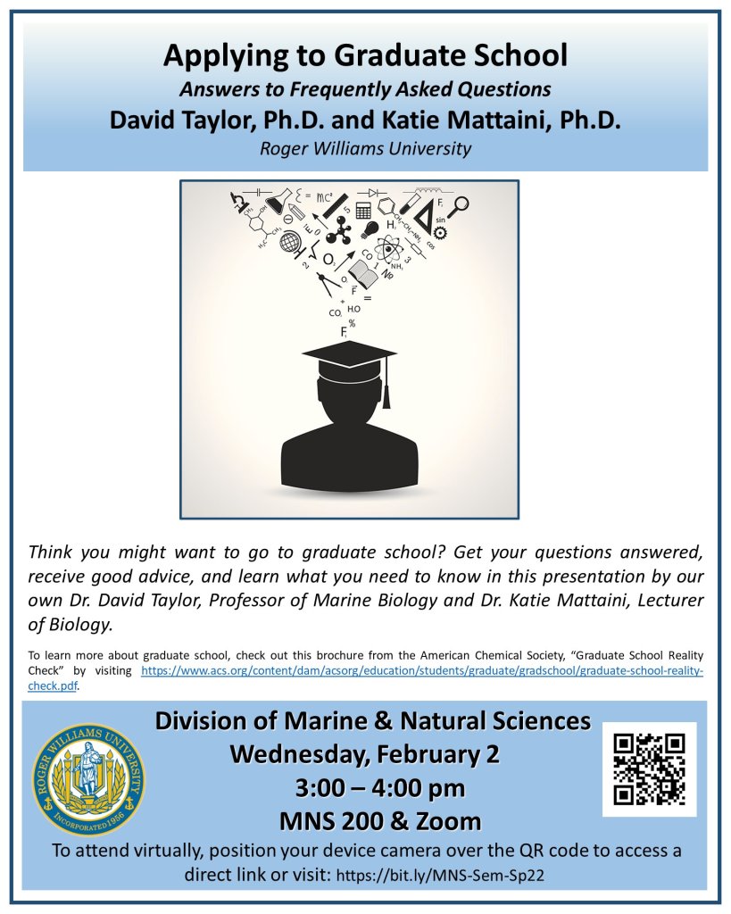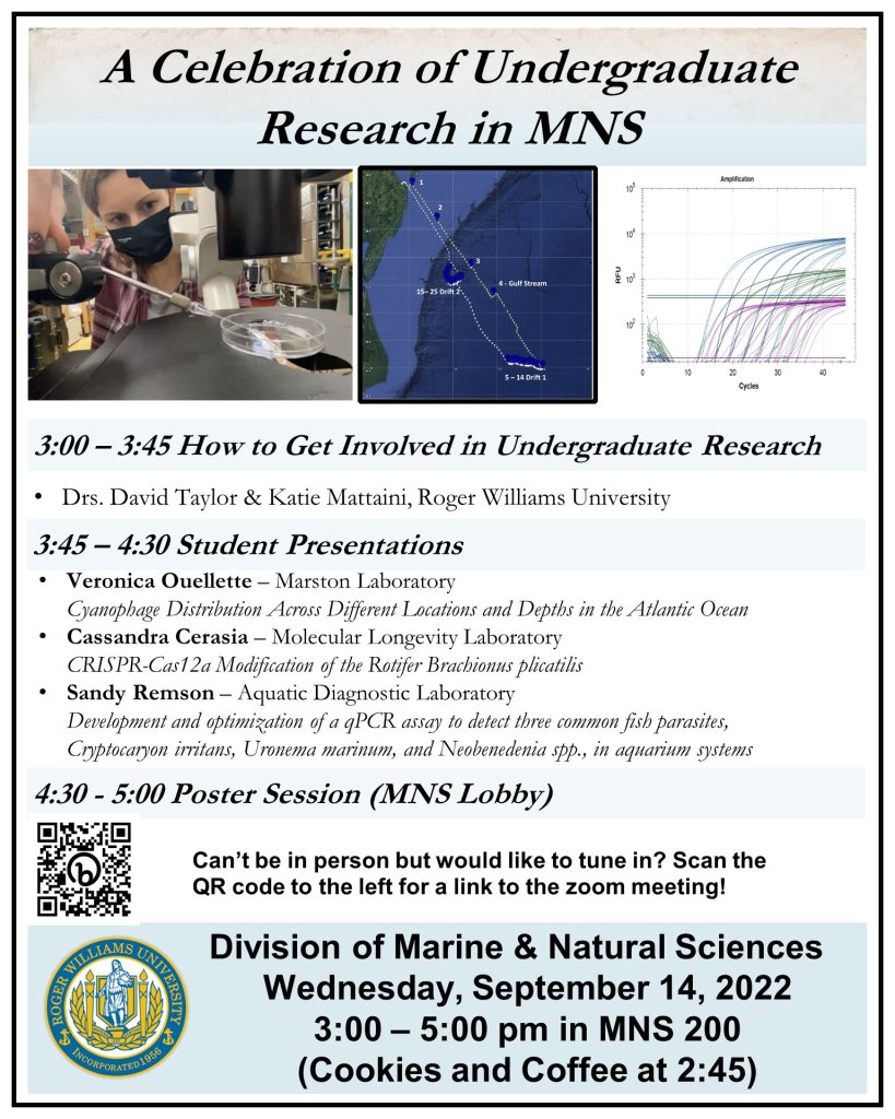 The weekly Roger Williams University Marine and Natural Science Seminar is held every Fall and Spring semester through the division of Marine and Natural Sciences in MNS 200 and/or on Zoom. We invite speakers from within and outside the RWU community to speak on scientific topics including biology, chemistry, physics, math, public health, industry, and science communication & policy. This seminar series also holds events like Meet your Advisor in the Fall and Applying to Graduate School FAQ in the Spring.