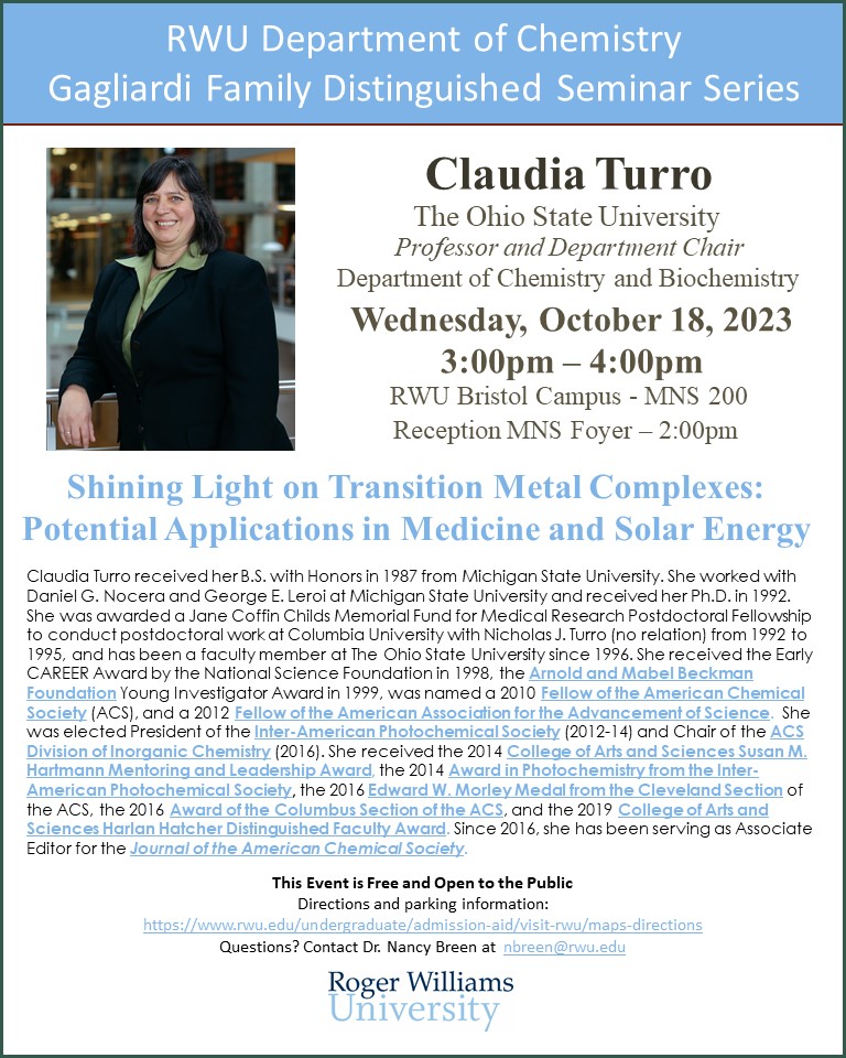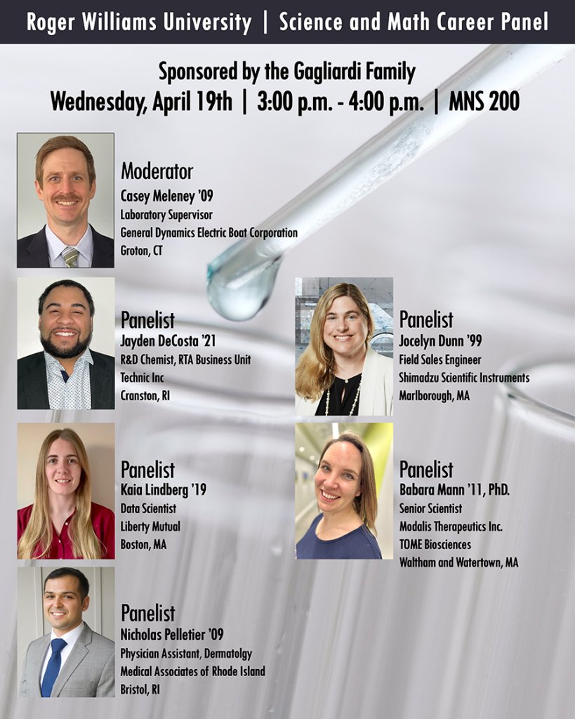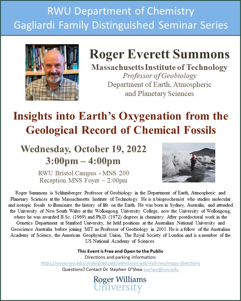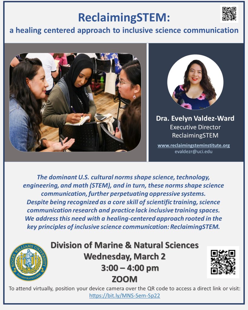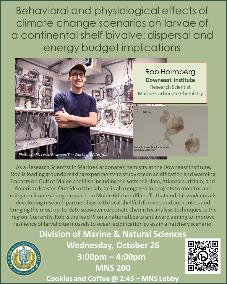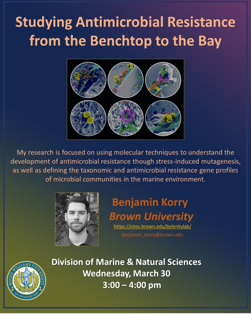 The weekly Roger Williams University Marine and Natural Science Seminar is held every Fall and Spring semester through the division of Marine and Natural Sciences in MNS 200 and/or on Zoom. We invite speakers from within and outside the RWU community to speak on scientific topics including biology, chemistry, physics, math, public health, industry, and science communication & policy. This seminar series also holds events like Meet your Advisor in the Fall and Applying to Graduate School FAQ in the Spring.