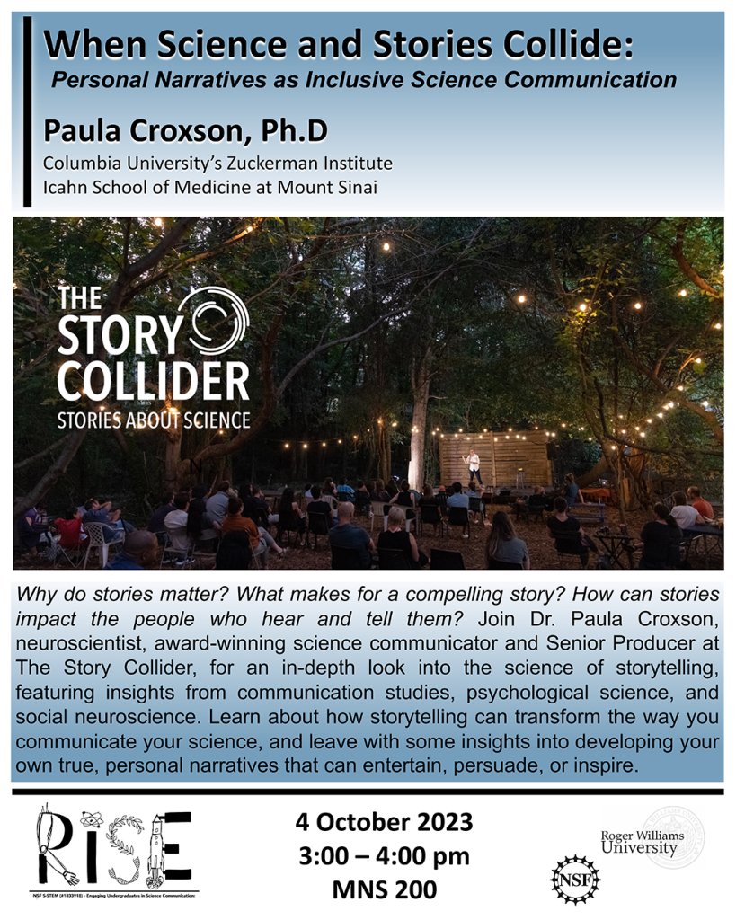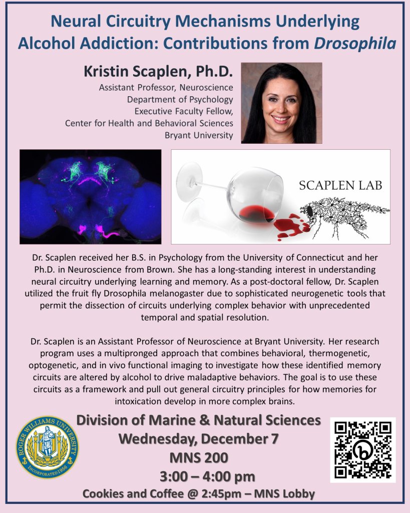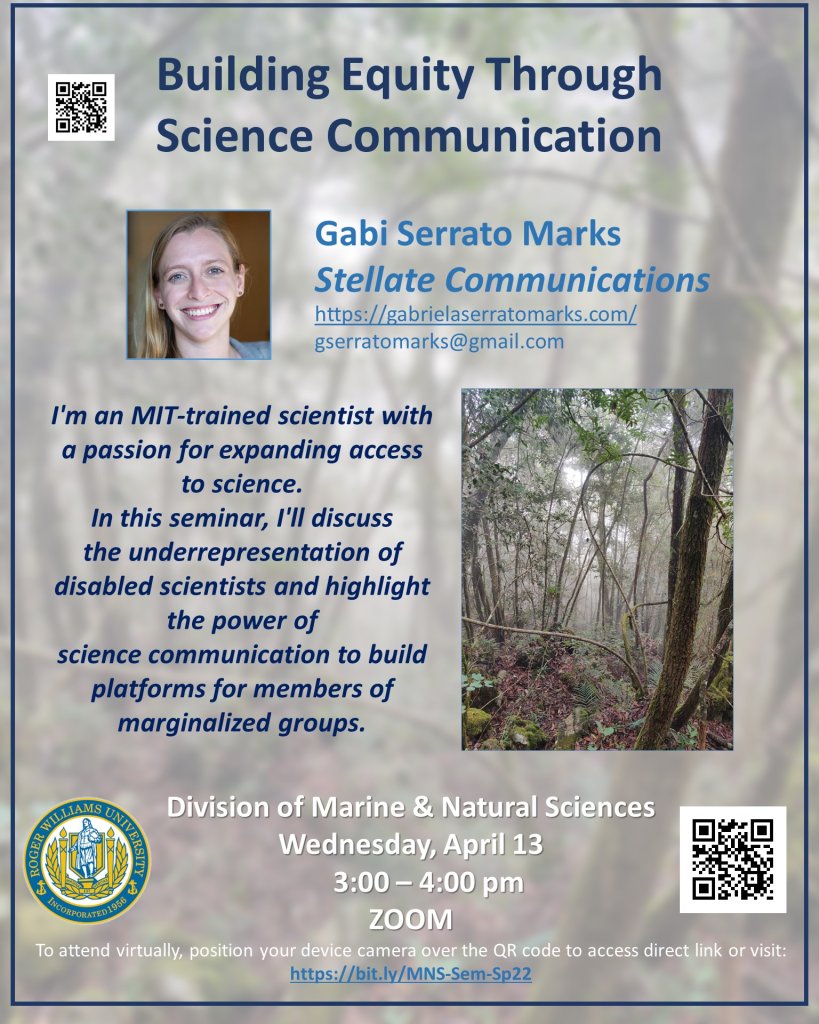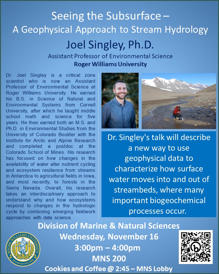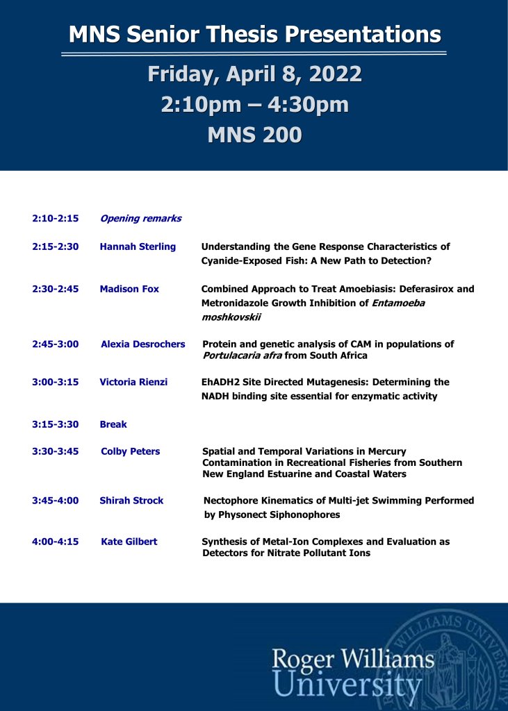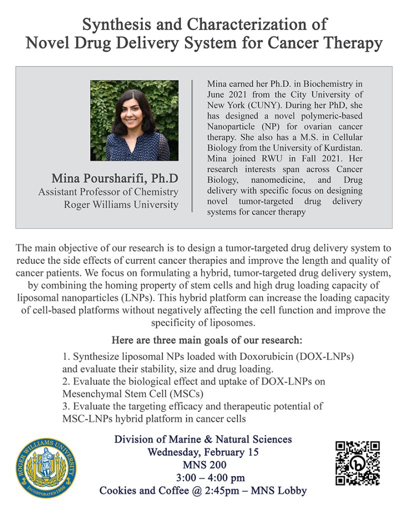 The weekly Roger Williams University Marine and Natural Science Seminar is held every Fall and Spring semester through the division of Marine and Natural Sciences in MNS 200 and/or on Zoom. We invite speakers from within and outside the RWU community to speak on scientific topics including biology, chemistry, physics, math, public health, industry, and science communication & policy. This seminar series also holds events like Meet your Advisor in the Fall and Applying to Graduate School FAQ in the Spring.