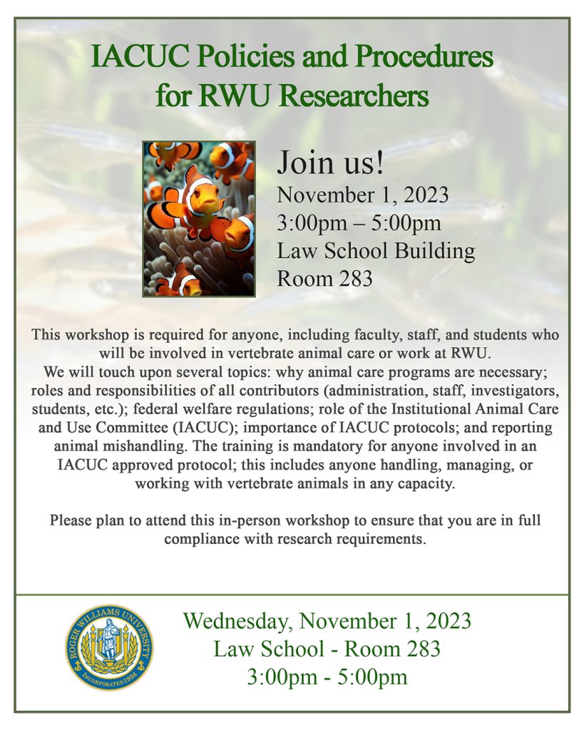 Description: This workshop is required for anyone, including faculty, staff, and students who will be involved in vertebrate animal care or work at RWU. We will touch upon several topics: why animal care programs are necessary; roles and responsibilities of all contributors (administration, staff, investigators, students, etc.); federal welfare regulations; role of the Institutional Animal Care and Use Committee (IACUC); importance of IACUC protocols; and reporting animal mishandling. The training is mandatory for anyone involved in an IACUC approved protocol; this includes anyone handling, managing, or working with vertebrate animals in any capacity. Please plan to attend this in-person workshop to ensure that you are in full compliance with research requirements.
