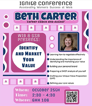Join RWU's Women In Business Club for an interactive workshop with career coach and author, Beth Carter! Learn how to identify and market your value in the workforce at this Ignite Conference.