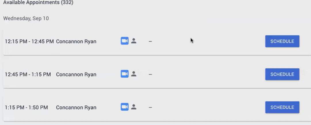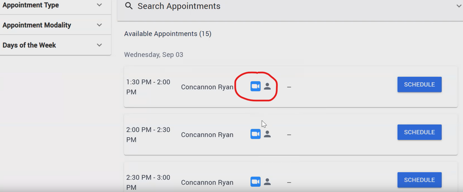 You will notice a gray human icon, that indicates you may book with the staff or faculty member in person. The blue camera indicates you may book an online zoom meeting