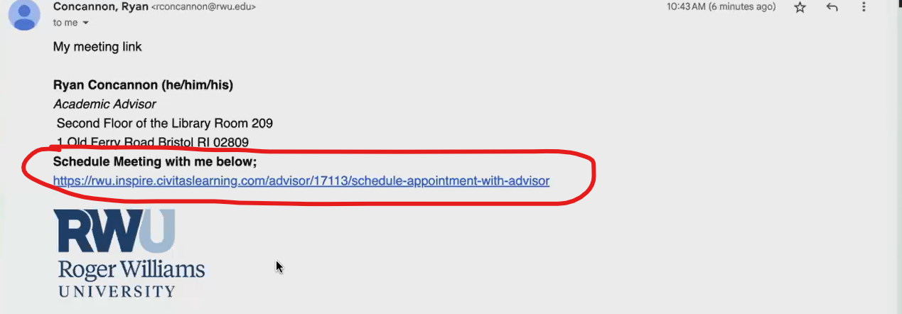 First, go to the email signature link. For any staff, or faculty member, it should say something like "schedule a meeting with me"