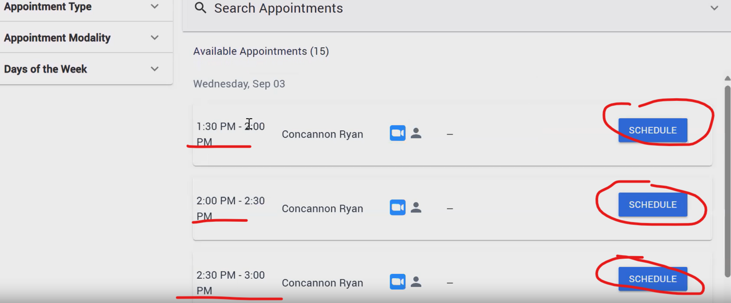 Once you choose a faculty or staff member, you may choose what time to meet them at