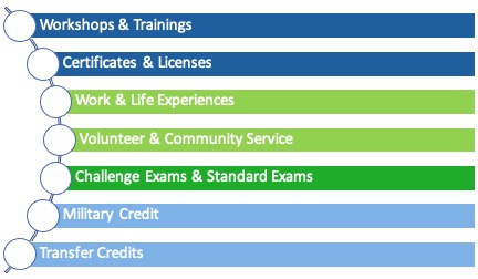 We have identified ten different types of experience that we consider prior learning: Workshops & Trainings, Certificates & Licenses, Work & Life Experiences, Volunteer & Community Service, Challenge Exams & Standard Exams, Military Credit, and Transfer Credits.