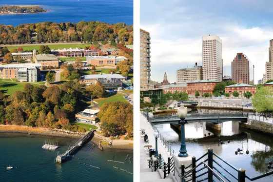 Graduate students at RWU study at one of two campuses: our main campus, situated on scenic Mount Hope Bay in Bristol, RI, and our metro campus, located in the heart of the state capital, Providence, RI. Each campus plays a vital role in the University's commitment to supporting and growing the local economy and providing vital resources to nonprofit organizations, corporations, and municipal governments throughout the State of Rhode Island.