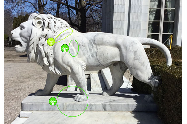 This lion sculpture is made of marble and is located in the front yard of Rosecliff. The approach to surveying each piece is systematic. For each piece that I surveyed, I took four parent photos and labeled them view one, view two and so on. This systematic approach was a theme in my Materials and Methods of Historic Construction class. This photo is of the forth view. Annotations for this view include two cracks and an area where erosion has occurred along a vein in the marble. Other concerns on the piece include loss, carbon deposits, surface dirt, and accretion. Accretion is a term used for the build-up of a certain substance. For this piece, I recommended testing the accretion because it’s the only way to determine what the substance that is building up. That will then determine treatment.