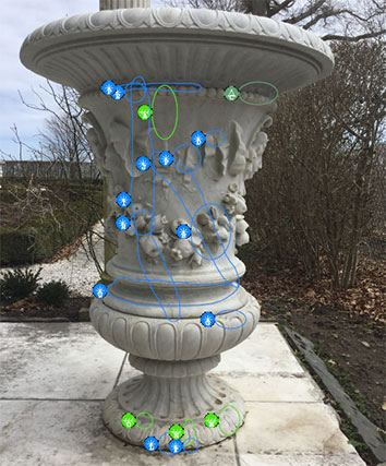 The urn is located in Rosecliff’s Rose Garden and is also made of marble. The piece has many areas of previous repairs including recreated elements, epoxy and cementitious repairs, and crack repairs. This photo is of the forth view. Annotations for this view include several previous repairs, cracks, and an area of loss.