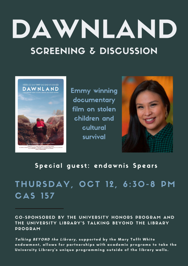 The inaugural Talking BEYOND the Library event, in partnership with the University Honors Program, features Lorén Spears, Executive Director of Tomaquag Museum in Exeter, RI. Her program is titled: “Through My Eyes: Indigenous Leadership, Education, & Empowerment.”