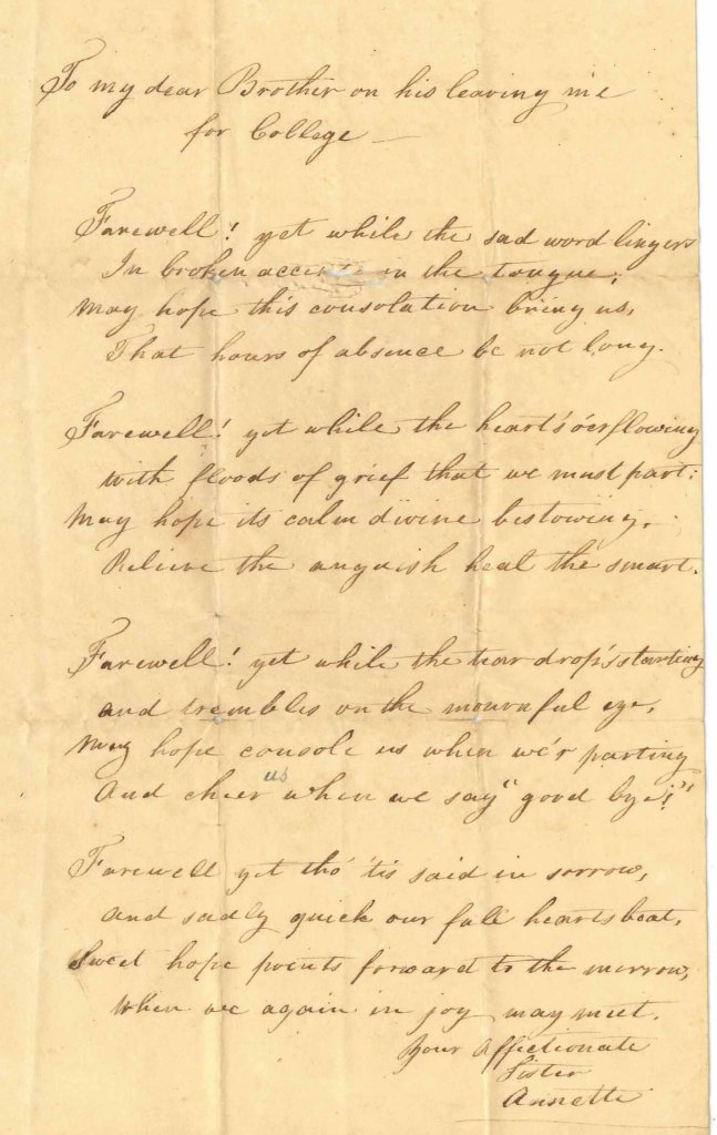 Handwritten letter fromAnnette Winthrop to her brother John upon his entering college in 1824: