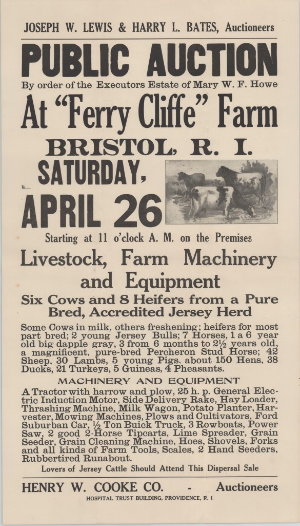 ![Poster announcing Public Auction at Ferrycliffe Farm, April 26 [1926], by order of the executors of the estate of Mary W.F. Howe](/sites/default/files/19XX_Ferry%20Cliffe%2C%20Public%20Auction.jpg)