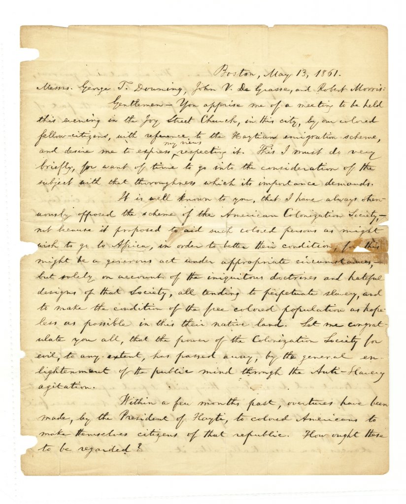 Handwritten Manuscript: First page of letter from William Lloyd Garrison to Messrs. George T. Downing, John V. DeGrasse, and Robert Morris, dated May 13, 1861, regarding Haitian emigration. VisIt the archives to see the complete letter.