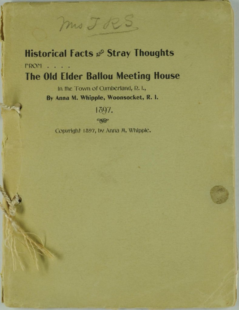 Pamphlet [cover image]: Whipple, Anna M., "Historical Facts and Stray Thoughts from The Old Elder Ballou Meeting House, in the Town of Cumberland, R.I.," 1897. [15] pages, 3 plates. Visit the archives to see the complete pamphlet.