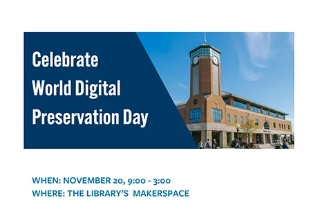 Join us in the Library Makerspace on November 20th from 9:00 a.m. - 3:00 p.m. to celebrate World Digital Preservation Day. With this year's theme Preserving Our Digital Content: Celebrating