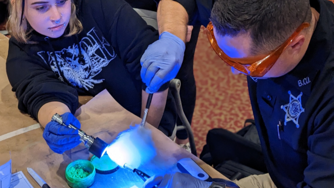 While the professionals gain key takeaways to apply directly in their field, the students who work alongside them learn skills that will propel them forward in their future careers. The undergraduate students who attended the training on Feb. 27-29 had the opportunity to learn how to use industry-standard equipment and operating procedures. Students took photos of blood stains, used chemicals to process fingerprints, and had access to a dark room dedicated to finding fingerprints using fluorescent powders.