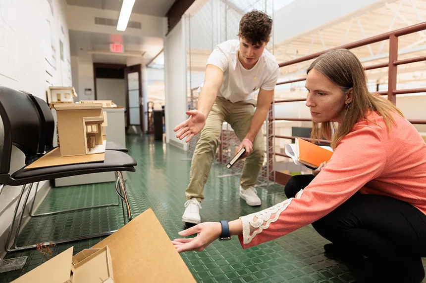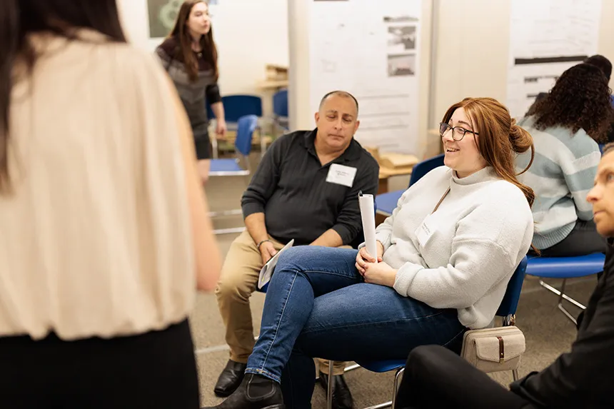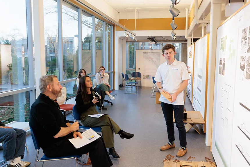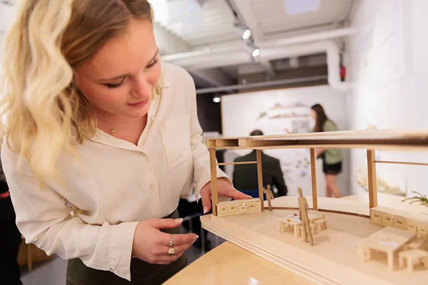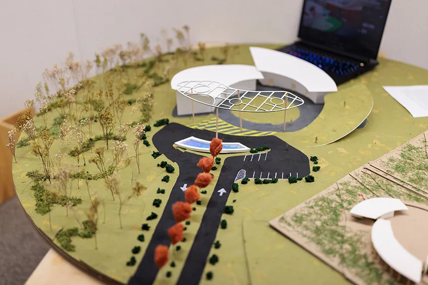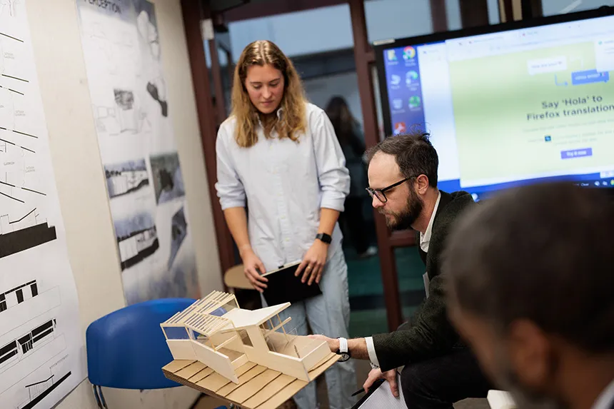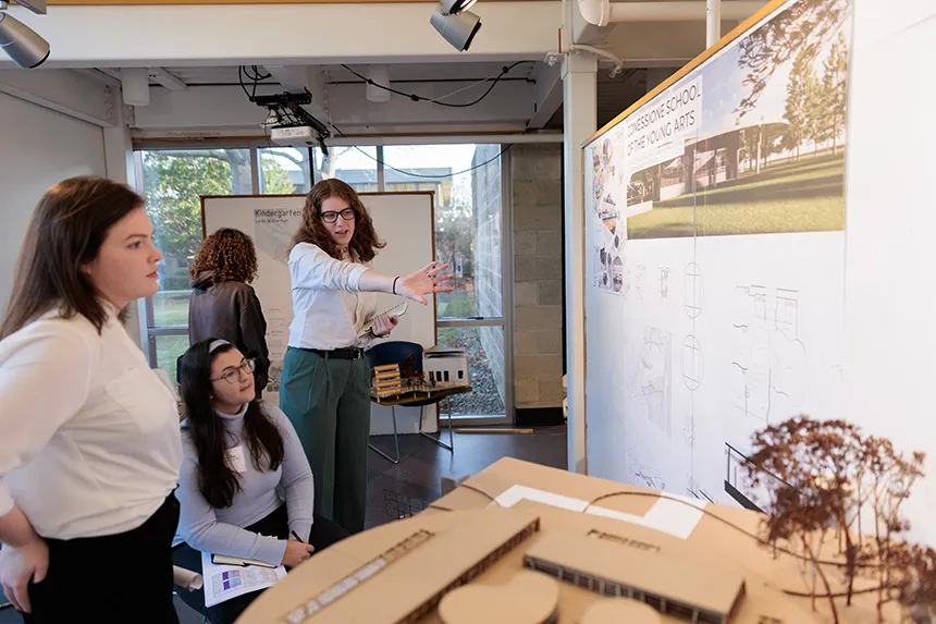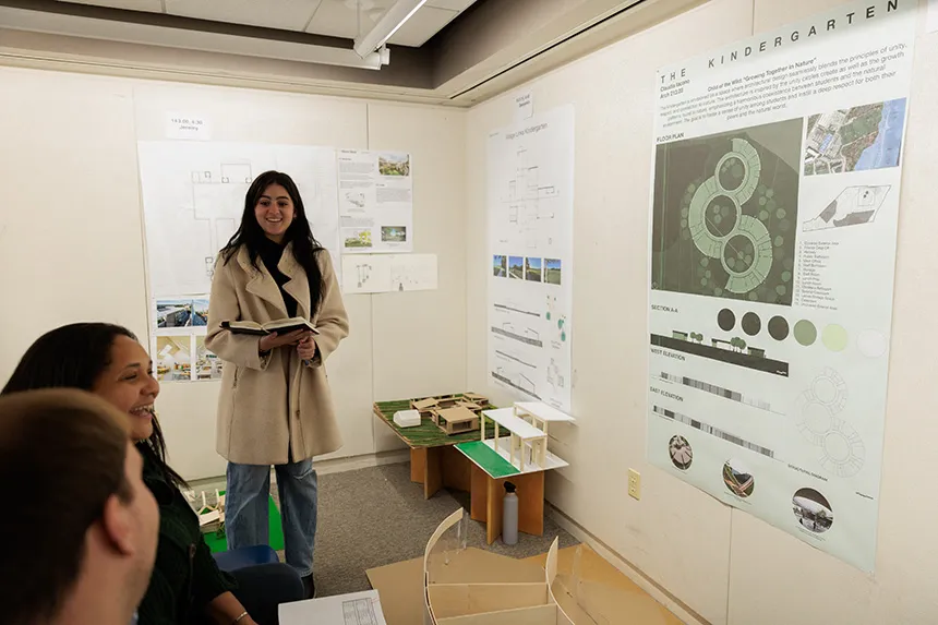 As part of the review, the third-semester Architecture students enrolled in one of two studio courses were presented with a theoretical challenge of designing a kindergarten with specified parameters, to be built at the Bristol campus’s former lacrosse and rugby fields. The students’ designs explored the intricacies of a building's relationship to its site, the development of spatial qualities, and the nuances of architectural detail. They began by creating an idea board and then shifted to site design, facility layout, and detailed proposals with large-scale dioramas. The review process challenged students to consider cohesiveness within the broader design narrative. As White said, the in-person event allowed for a lot of interaction and conversations to flourish between students and reviewers.