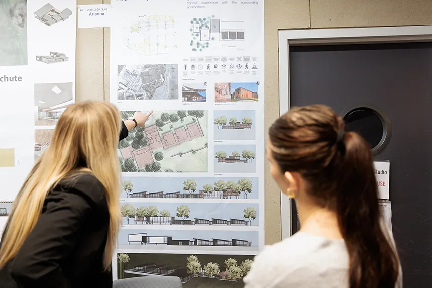 The brainchild of Gregory Laramie, Associate Dean of the Cummings School of Architecture, the gallery-style studio review brought together more than three dozen alumni from across the region to critique students’ final design projects. The event was a well-orchestrated affair, with alumni paired together and assigned six projects to assess in 15-minute increments over two hours. Each student presented their designs, provided an overview of their buildings and explained their thought process using detailed schematics. In return, alumni provided professional feedback, highlighting commendable aspects of the plans and offering constructive advice where needed.