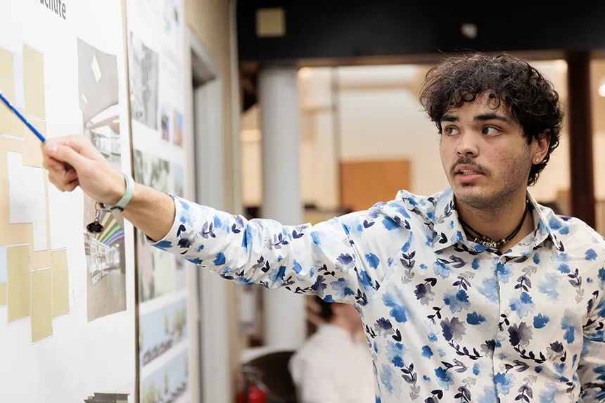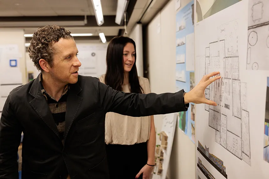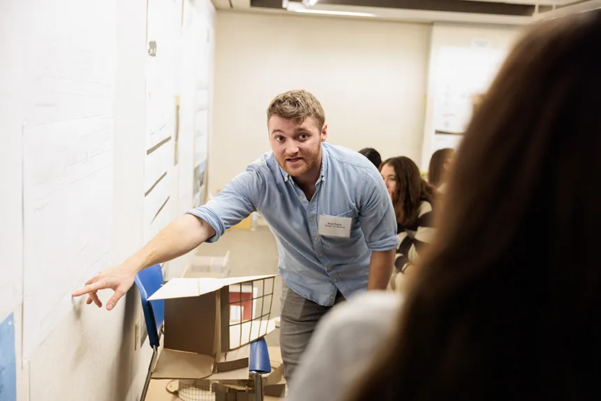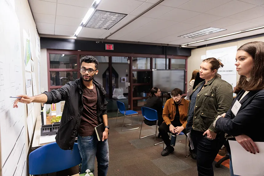 Lauren Irons ’17, M ’19, whose own architecture reviews are hardly a distant memory, applauded the studio review for offering students the opportunity to get personalized feedback on their designs. “We only did this gallery-style [review] in our graduate program. It’s nice to introduce this style earlier because it’s a bit more intimate with each student where you can better hone in on their concepts. That’s something you don’t always get the chance to do in larger settings,” said the architectural designer, who now works for KG+D Architects in Mount Kisco, N.Y.