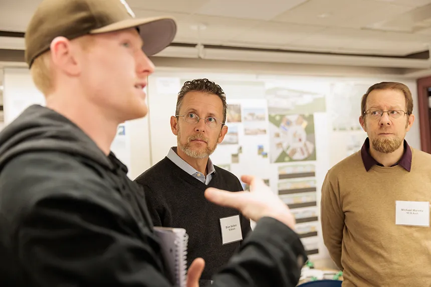Junior Dylan Steward, an Architecture major with a minor in Construction Management from Bedford, N.H., said he was grateful to hear advice from alumni. “I really appreciate feedback from professors, especially those who have been around for a while, but it's also refreshing to have reviewers who had the same teachers that I have, similar experiences, and who have been influenced by the same people. I felt like we could relate a lot better.”