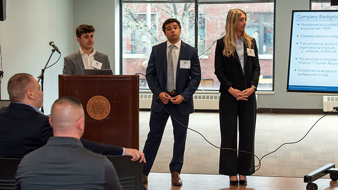 For the automotive company, Motodynamics, MBA students Isabella Wierzbicki ’23, M’24 of Wareham, Mass.; Orlando Fernandes ’23, M’24 of Trumbull, Conn.; Kevin Murphy ’23, M’24 of Ramsey, N.J.; Edward Troyano ’23, M’24 of Wading River, N.Y.; Nathan Nichols ’23, M’24 of Framingham, Mass.; and Ari Dinerman ’23, M’24 of Ashland, Mass., proposed solutions for navigating international financial crises, ranging from the internationalization of operations to the establishment of an internal crisis management task force.