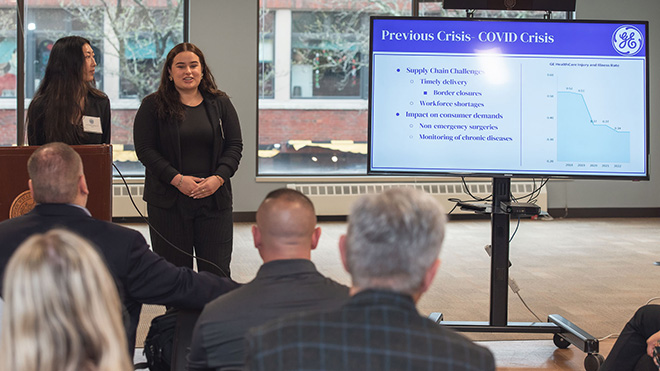 Taking a look at how major global companies can respond to worldwide events, the student team of Halei Allen-Morabito ’23, M’24 of Manorville, N.Y.; Emily Neubig ’23, M’24 of Northford, Conn.; Emma MacLean ’23, M’24 of Newton, Mass.; Hailey Pereira ’23, M’24 of Fall River Mass.; and Leila Dumas Hovey ’23, M’24 of Quincy, Mass., explored how GE Healthcare navigated global crises like the recent Ukraine-Poland conflict and the COVID-19 pandemic. Their approach advocated for the implementation of predictive AI, enabling proactive resource allocation and strategic planning to navigate future crises effectively.