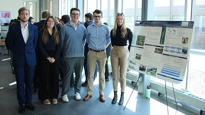 As part of their Senior Engineering Capstone project, five students spent this past academic year evaluating the Shad Factory Pond Dam in Rehoboth, Mass., owned by the Bristol County Water Authority, in order to make a recommendation about whether to remove the dam or keep it in place.
