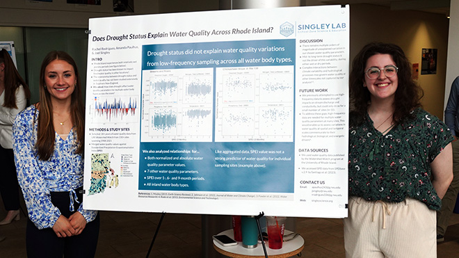 Wanting to investigate whether drought status explains water quality across the state of Rhode Island, Paulhus, an Environmental Science major and Mathematics minor from Foster, R.I., and Rodrigues, an Environmental Science major and Sustainability Studies minor from Warren, R.I., used data from the University of Rhode Island’s Watershed Watch database to look at lakes, ponds, rivers, streams, and reservoirs and analyze information from 150 sites from 1988 to 2021. They noted that drought status has been known to affect water quality in other locations but hasn’t been studied extensively in southern New England.