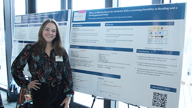 For her research project, Olivia Agoros ’23,who will be graduating with a Master’s of Special Education this May, focused on the implementation and outcomes of an Elkonin Box Instruction intervention, which is designed to enhance phonological awareness skills in students with learning disabilities and developmental delays, particularly by focusing on phoneme segmentation and spelling.