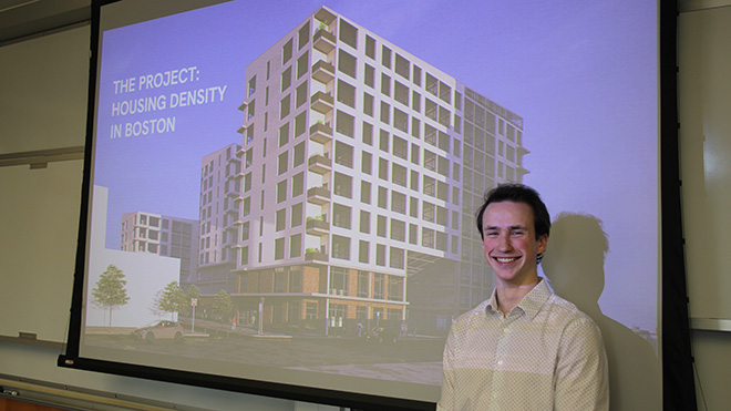 For his Honors Capstone, based on his most recent Architecture studio project, senior Ryan Spillane focused on urban living, specifically designing affordable housing in the Boston area that balances density with open space.