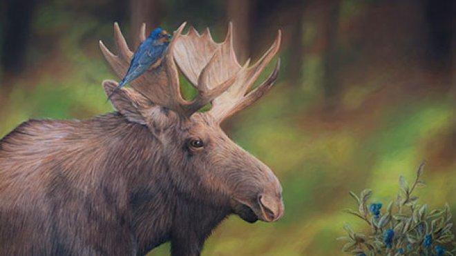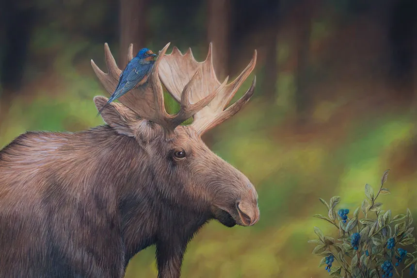 BRISTOL, R.I. – With flowing strokes, Nicholas Bezio strives to capture the golden sunlight bathing a North American moose, drawing the viewer’s eye around the composition. And just as much as he entices viewers aesthetically, he uses colored pencils like scientific tools to render with meticulously accurate detail the majestic mammal’s distinctive nose, the shape and prongs of its sinewy horns.
