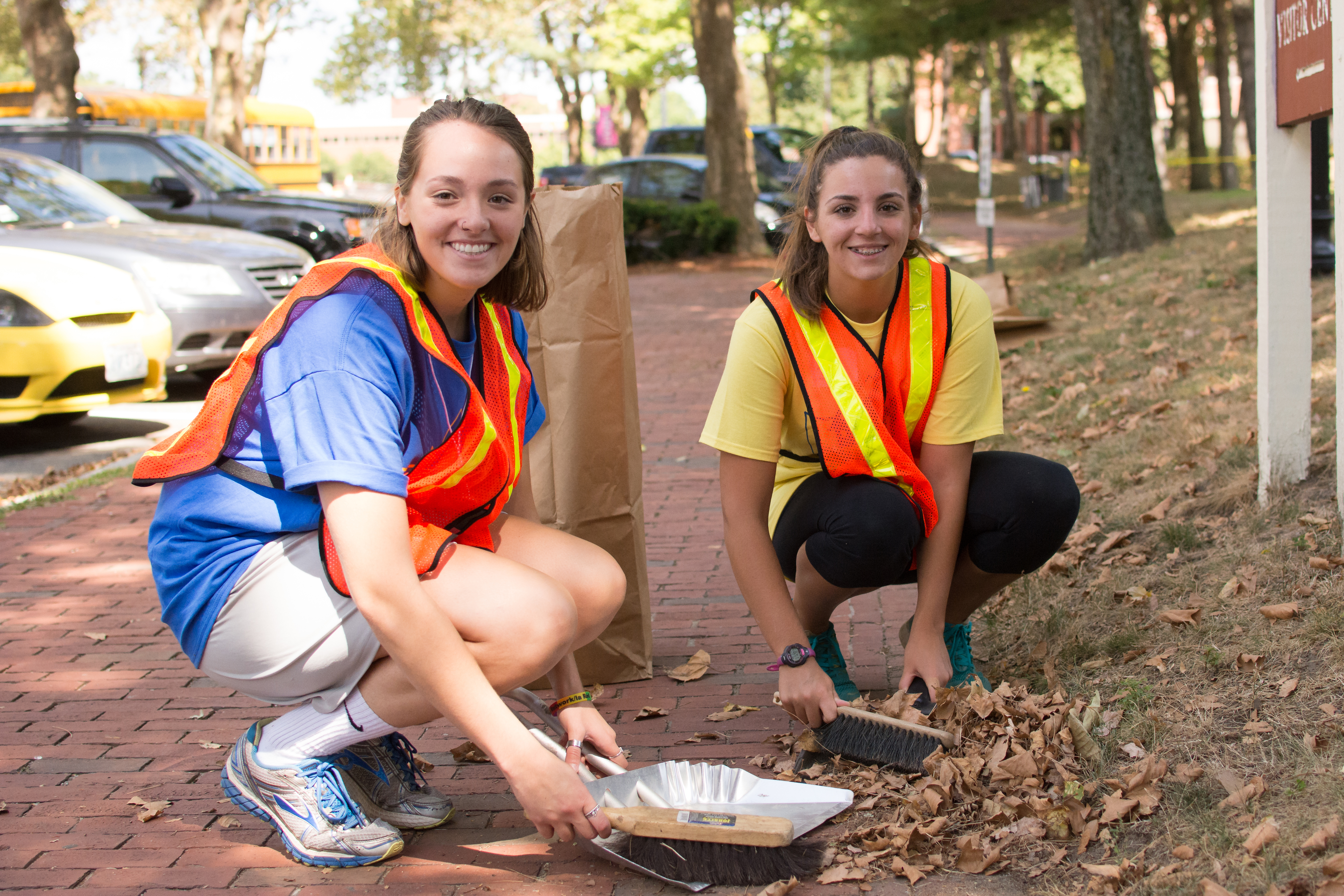 Kylie Hofhaugh ’19 (left) and freshman Kaitlyn Savarese of Sainsbury, Conn., became quick friends as they worked together to clean Roger Williams National Memorial during this year’s Feinstein Community Connections Day.