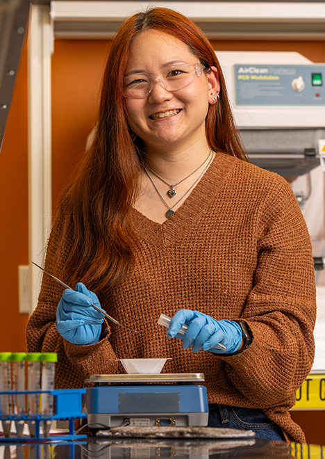 Beyond the lab, she has taken on leadership roles across campus, serving as president of the Asian American Alliance and secretary of the Science Alliance, while also working as a peer tutor in Chemistry and Physics.