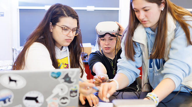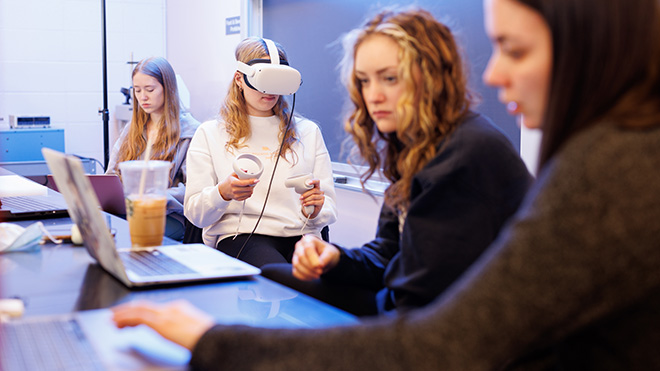 Students work in groups of four, each taking on different roles. One student uses an Oculus headset, which immerses them in the VR scene, while the other students take notes and make sure the student wearing the headset doesn’t bump into anything in the classroom while they’re walking around the VR world.