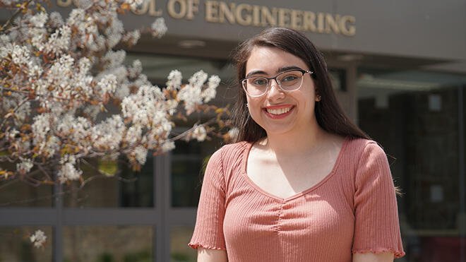 Cassidy Methot standing in front of the School of Engineering, Computing, and Construction Management.