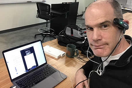 "In Engineering 350, the students apply principles I present in lecture to a half-semester long project. Usually, they would take apart an experimental apparatus that I’ve built, and then put it back together to become very familiar with it, but clearly that isn’t possible now. The substitute that I came up with was using a camera that I wear mounted next to my ear to film the apparatus. If I look at something, the camera looks at it automatically. I also have my hands free to point to various parts of the apparatus. I can’t meet the learning goal of them actually taking something apart and putting it back together, but I can meet the learning goal of them being able to identify the portions of the experiment and give them names, which is an important skill to have when you’re talking about building an experimental apparatus.
