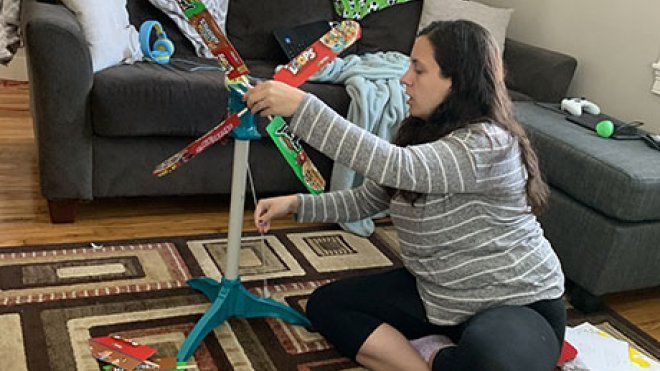 Jessica Silva, a fourth grade teacher in the Bristol Warren school district, is using the lesson plans along with a KidWind turbine kit to teach her students remotely. Her students meet learning objectives by communicating their turbine blade designs to Silva, who builds them from cardboard and tests them live for her class through Google Hangouts. Her students record data and improve their designs, learning the engineering design process through this experiential activity.