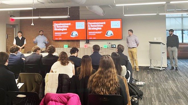 Guided by Associate Professor of Business Management Alexander Knights in their Management Consulting course, students worked in teams, each paired with a Shawmut mentor who provided industry insights and feedback throughout the process. Instead of studying case studies from textbooks, students worked directly with company leaders, met regularly with mentors, toured an active construction site, and gained first-hand exposure to practical business challenges through campus visits from Shawmut professionals. Their work culminated in final presentations at Shawmut’s Providence office, where they delivered their findings and proposals to company leadership.