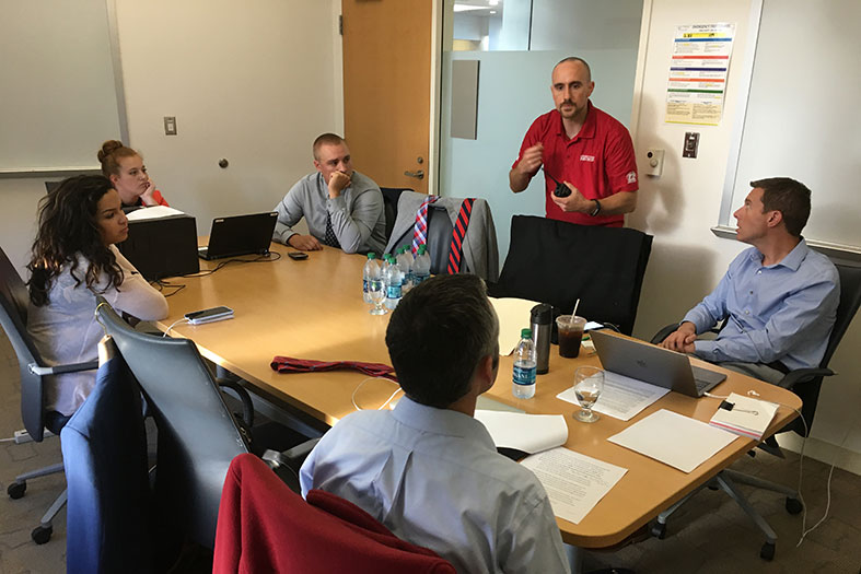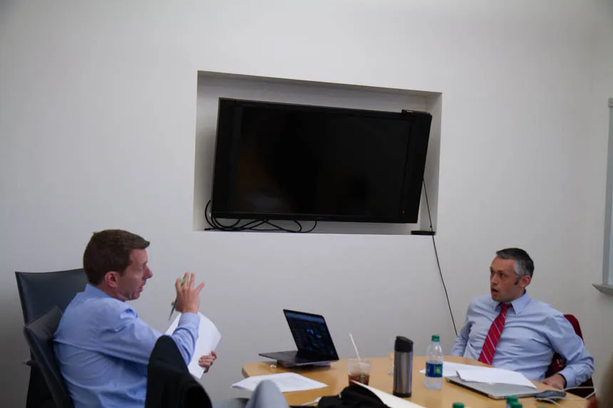 Seated at a small table inside a closed-off conference room in GHH, three senior journalism majors – Natalie Almeida, Rosalita Capoldo and Tyger Allen – follow WPRI 12 reporters Tim White and Ted Nesi’s rapid-fire “mock debate” as they prep as moderators for the live show in a few hours. With their suit jackets hanging nearby, a selection of ties draped atop, Nesi assumes the role of a candidate while White practices shooting off questions, anticipating vague answers, and correcting misrepresented facts by exhaustively knowing the details of political issues.