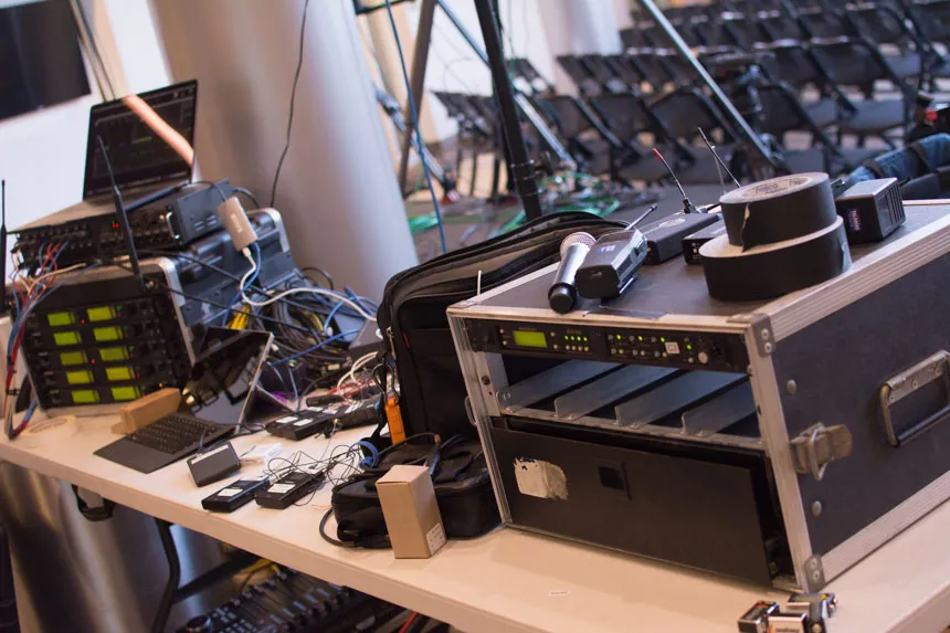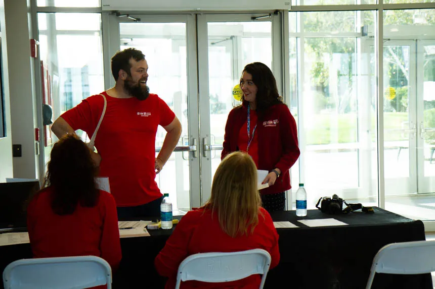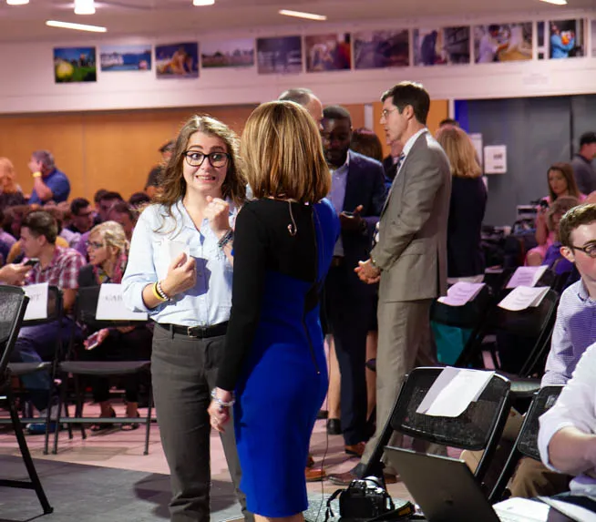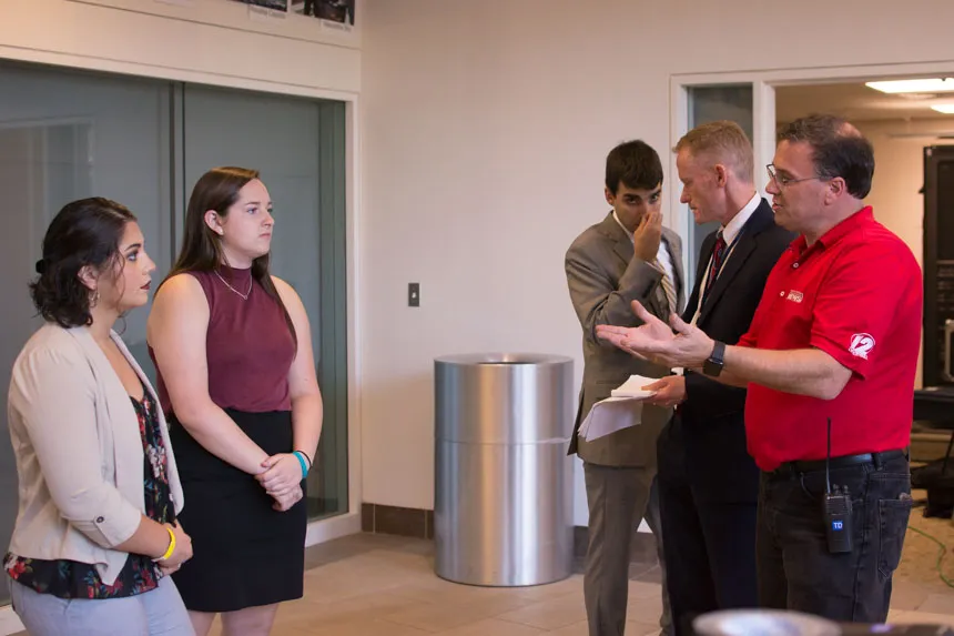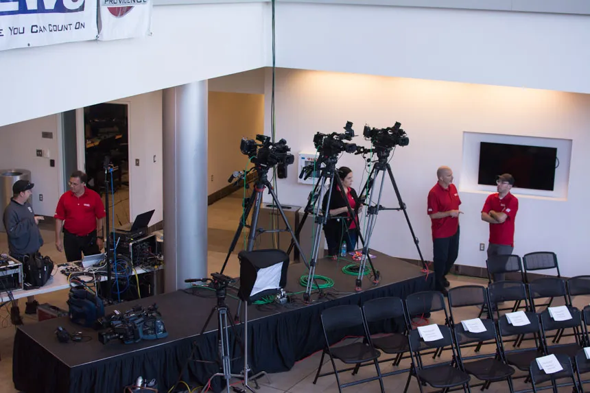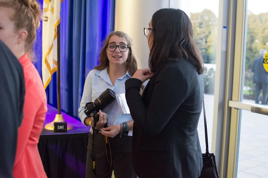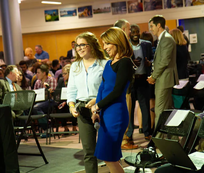 Inside the atrium, Angeli Tillett, a junior political science and journalism double major, and Britney Dixon, a junior journalism major, speak with WPRI Assistant Chief Engineer and Director of IT Michael Hyde about the planning that goes into an event like this. Tillet and Dixon listen as he tells the pair about all the logistics they planned, from sound to lighting, and how they're now putting it into action at a breakneck pace. “We’ve been planning since July,” he says. “It’s been a lot of communication.”