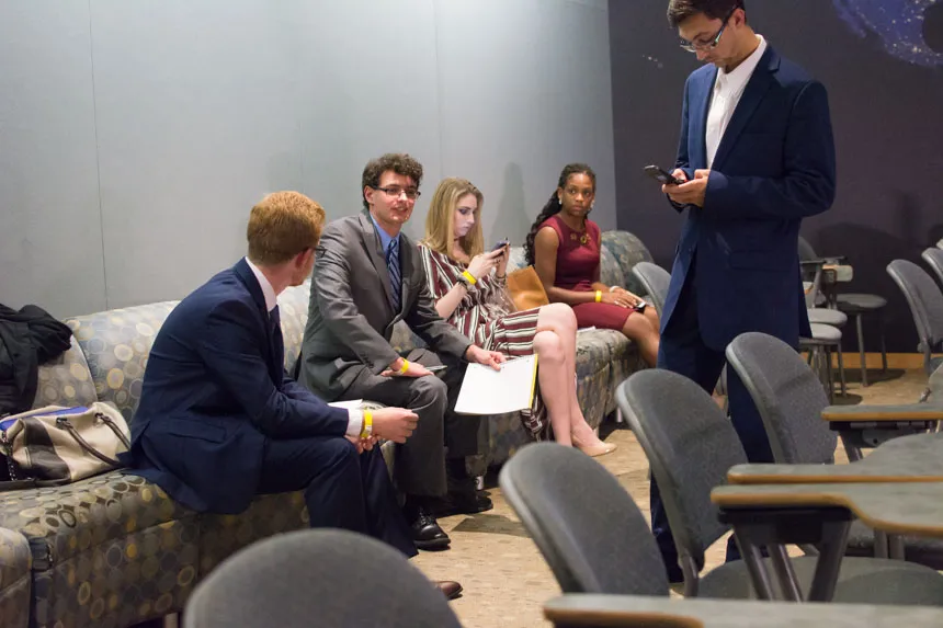 A moment of silence hushes the multimedia room as the student-panelists listen intently to the candidates’ closing statements and take final notes for their discussion. A few minutes later, they get the signal that they’re preparing to go live in five seconds.