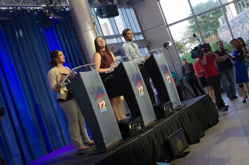 As showtime approaches, Noah Ashe, a junior journalism major, Britney Dixon and Angeli Tillett play the part of the three candidates at the podium, as the WPRI crew tune the audio. The students are seeing first-hand how a live event goes on without a hitch.