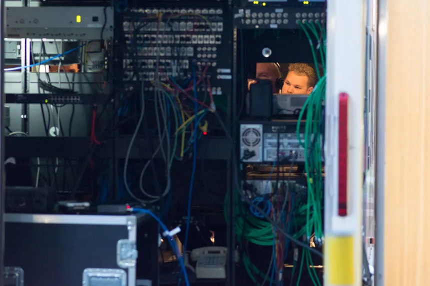 During the debate telecast, Ciuci and Crawley will remain inside the control room, watching the production crew and technical director stream a live broadcast. With just 20 minutes to go before the debate, the production team crew closes the van doors.