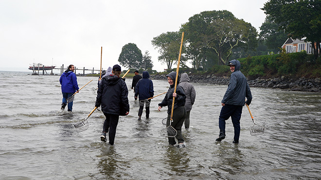 NORTH KINGSTOWN, R.I. – With rakes and buckets in tow, a group of Roger Williams University School of Law students devoted a rainy Friday afternoon to wade through nearly waist-high water and dig for a delicious treasure hidden beneath the waves of Narragansett Bay.