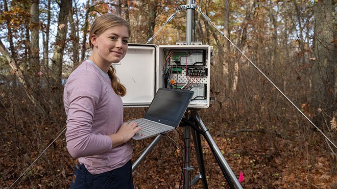 In a Nutshell: Responding to impacts of climate change, the Bristol County Water Authority is removing the lower Kickemuit River dam in Warren to restore the area to a more natural state and improve flood resilience. Greenhalgh’s research involves monitoring the water quality in the dam, reservoir, and groundwater before, during, and after the dam removal. She’s also observing how trees react to the drop in water and if they have a change in sap flow. Using wells and a monitoring station located near the dam, she is able to test both soil moisture and sap flow in trees. The monitoring station consists of a white data logger box attached to a metal stand that contains wires and cables that attach to trees and can be connected to a laptop. The station runs on batteries powered by solar panels attached to the top of the stand. “Because this is a freshwater system that’s connected to a saltwater system, Narragansett Bay Estuary Program wants to work on that connection and make sure the water quality is doing what they would like it to do, and that it’s growing healthily,” she said.